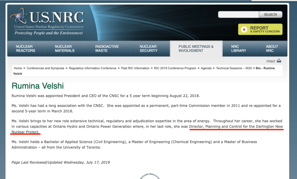 The CNSC’s current president, Rumina Velshi, prior to her appointment at CNSC, worked for Ontario Power Generation for eight years in senior management positions and led the OPG commercial team involved in a multi-billion dollar proposal to procure new nuclear reactors as noted below in the announcement of Ms. Velshi’s appointment on the US Nuclear Regulatory Commission website.