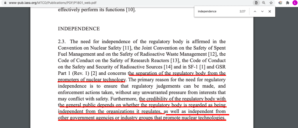 The International Atomic Energy Agency provides explicit guidance on the necessary independence of the nuclear regulatory agency in order to ensure safety and public confidence. The guidance is provided in the IAEA “General Safety Guide No. GSG-12, Organization, Management and Staffing of the Regulatory Body for Safety”. Here is a screen capture from page 22 of that publication (emphasis added).