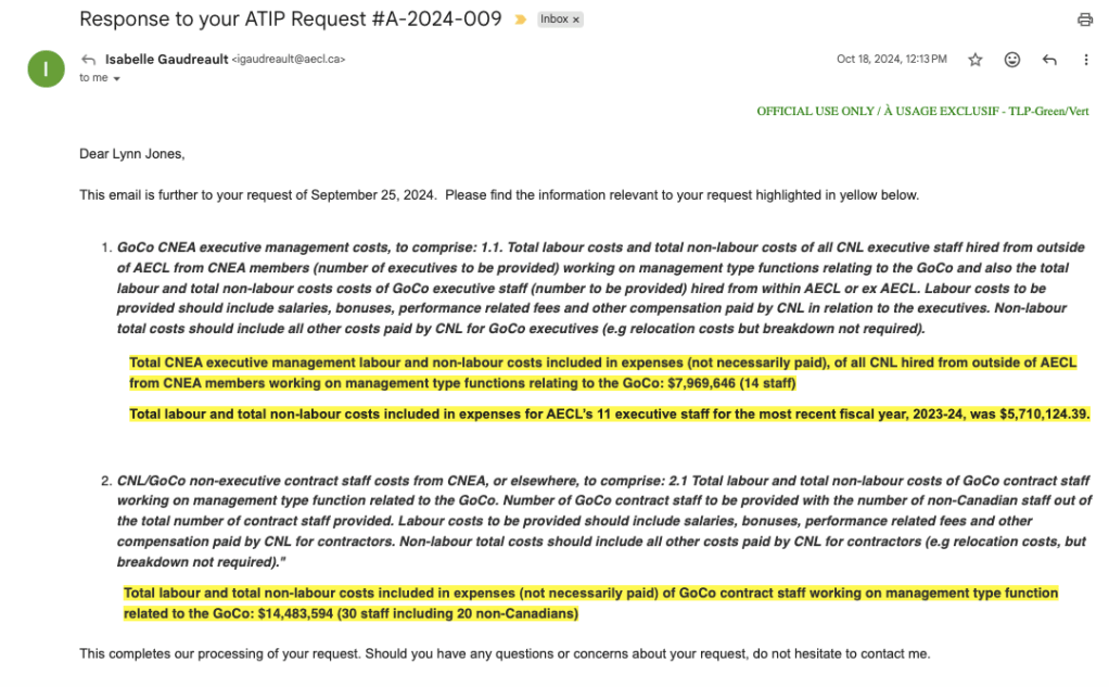 An October 2024 follow-up ATIP request (see screen cap below) revealed that the average salary for 14 senior executives was $569,260 per person per year and the average salary for 30 non-executive senior contractors (20 non-Canadians) was $482,786 per person per year.