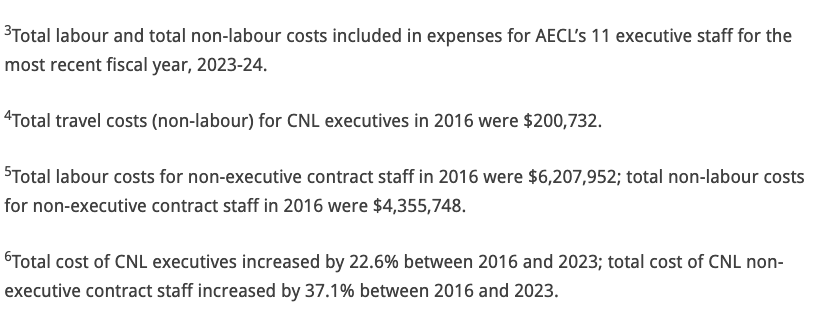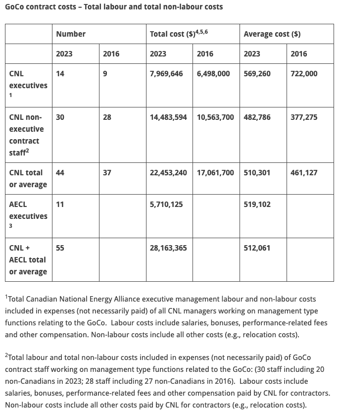 - Nine senior executives of CNL were paid an average of $722,000 per person per year (including travel) and most were non-Canadian.