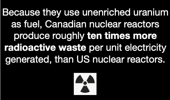 A key takeaway from this briefer is that because they use unenriched uranium as fuel, Canadian nuclear reactors produce roughly ten times more radioactive waste per unit electricity generated, than US nuclear reactors.