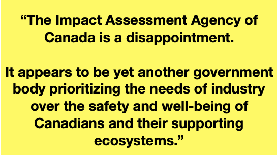 The Impact Assessment Agency of Canada is a disappointment. It appears to be yet another government body prioritizing the needs of industry over the safety and well-being of Canadians and their supporting ecosystems.
