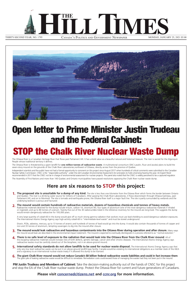 Kebaowek First Nation applied for a judicial review of the CNSC decision to license the NSDF on grounds that the Canadian Nuclear Safety Commission’s failed to secure Algonquin First Nations’ free, prior and informed consent for disposal of hazardous waste in their territory as mandated by the United Nations Declaration on the Rights of Indigenous Peoples Act. The case was heard by Justice Julie Blackhawk in a two-day hearing July 10 and 11 in Ottawa. The lead lawyer for Kebaowek, Robert Janes KC, was brilliant in arguing the case. He has represented First Nations many times in the Supreme Court. Justice Blackhawk’s decision is pending and may take several more months. Donations to the GoFundMe campaign to help cover Kebaowek FN’s legal costs are greatly appreciated. The campaign page is here.